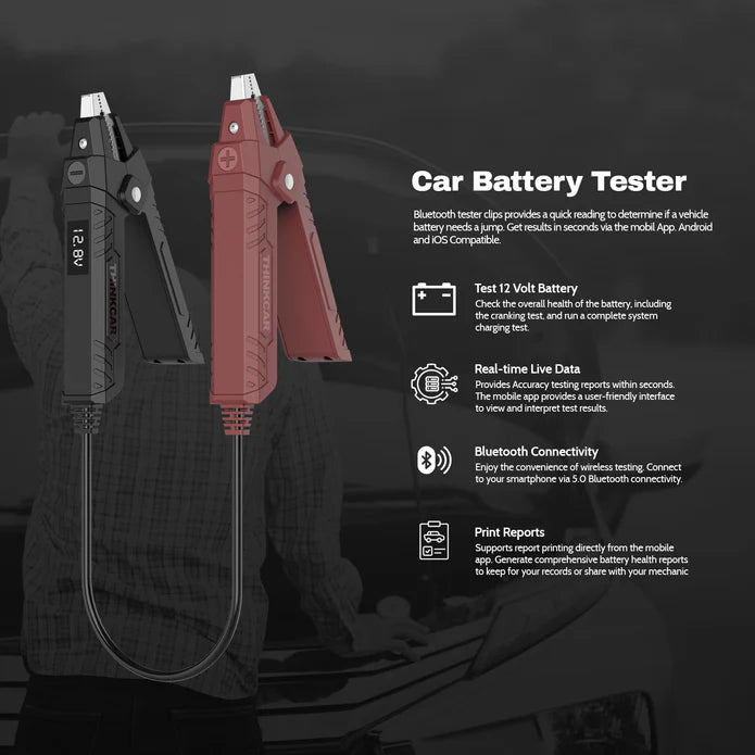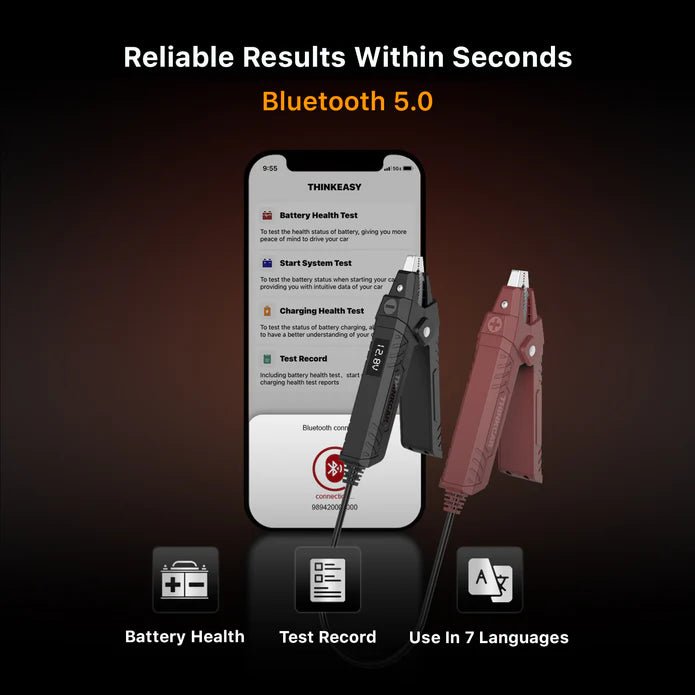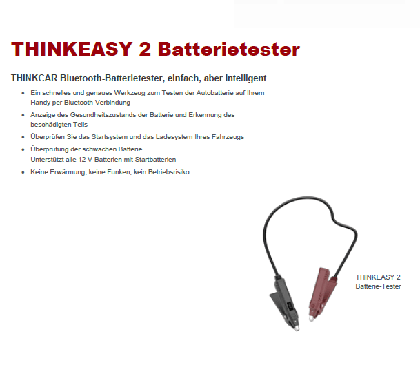 The THINKEASY 2 battery tester offers you a fast and precise way to test your vehicle's battery directly via your smartphone or diagnostic device – completely wireless and with a Bluetooth connection. Ideal for quick diagnostics in the workshop or on the go!
