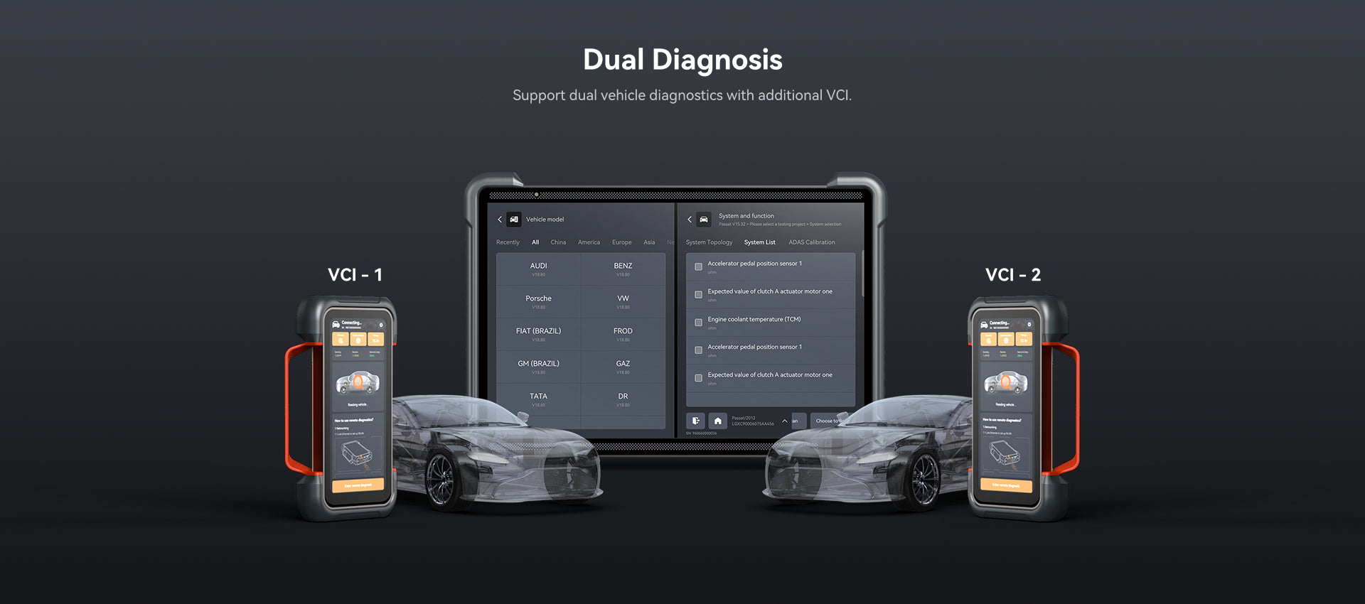 Supports an additional VCI module so that two vehicles can be diagnosed simultaneously.