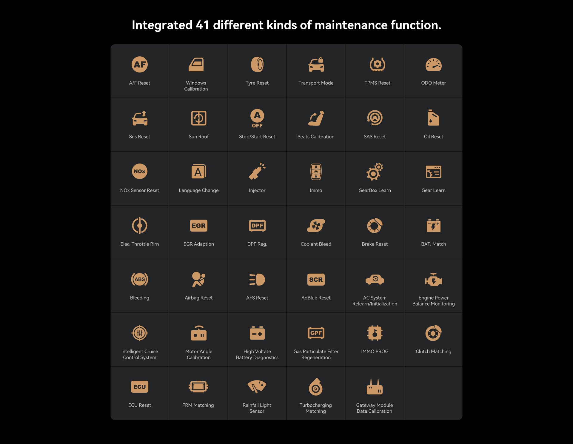 - Full diagnosis – Comprehensive system diagnosis for engine, transmission, ABS, airbag, air conditioning and more