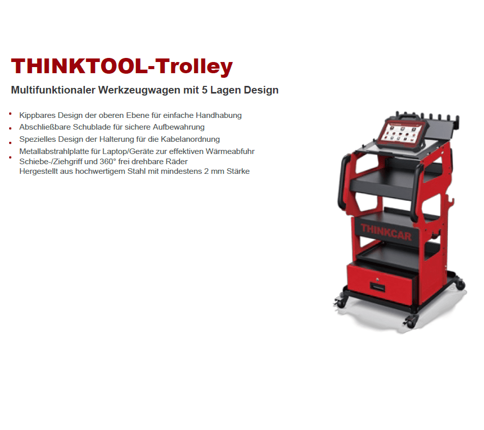 Anfrage sendenThe THINKTOOL Trolley is the ideal addition to your diagnostic equipment. With its sophisticated design and high-quality materials, it ensures that your diagnostic tool and accessories are stored safely and within easy reach – right where you need them.