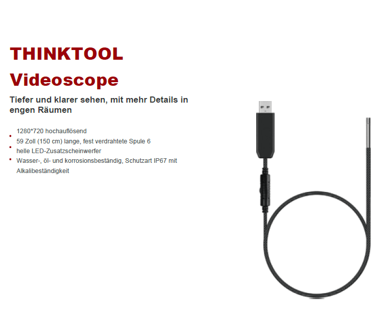 With the THINKTOOL Videoscope, you gain precise insight into areas that would otherwise be difficult to access. Simply connect to your diagnostic tool via USB and the high-resolution camera image is displayed directly on the diagnostic tool's large screen – for detailed analysis and fast troubleshooting.