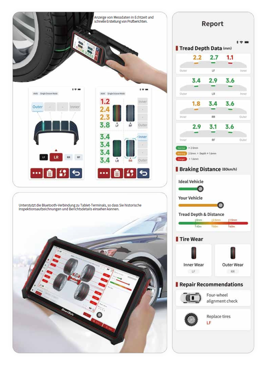 • Reporting : You can generate detailed inspection reports containing tread pattern data, wear analysis, estimated braking distances, and maintenance recommendations. These reports can be easily shared via QR code after Wi-Fi connection.